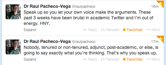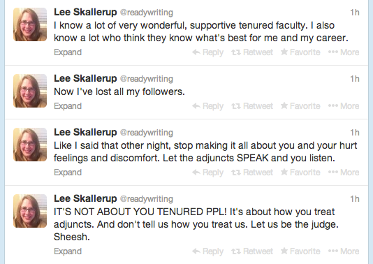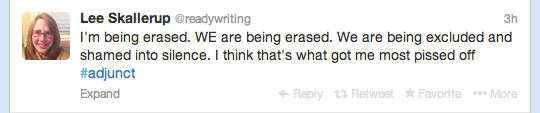 Call-out culture and resulting Twitter outrage can generate swift offline effects, in academia as well as in the general public, illustrated by the University of Illinois’ rescinding of Steven Salaita’s job offer after donors protested tweets about Palestine (Jaschik, 2014). Though the Salaita case only occurred just after the conclusion of the study, tactical uses of academic Twitter did generate controversy and responses from participants during the participant observation period, particularly in an extended, amplified, and very public debate around adjunct issues. Participants contributed from different positions and in different registers; discussions afterwards indicated that the public nature of the controversy was difficult for all to navigate.