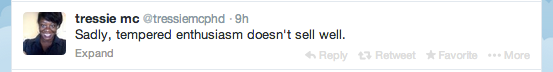 Some tweets lamented challenges or invited commiseration. These often triggered reciprocal expressions of attention, through “favorite” or “like” signals, retweets, or responses, thus expanding the original speaker’s visibility in wider publics. Self-deprecation or humor was regularly used to mitigate the invitation to pay attention. Dayter’s (2014) attenuation strategies, including disclaimers, shifts in focus, self-denigration, references to hard work, and third-party complaints, were all visible within the research data, and were employed most often by resident scholars with highly relational and wryly humorous approaches to NPS.