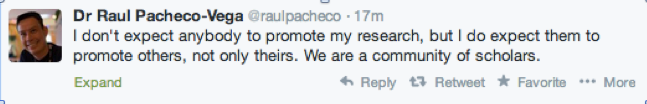 @raulpacheco: I deliberately tweet in English. I have confronted complaints from other academics in Mexico about this, but a lot of Mexican students and Mexican scholars follow me even though they know I tweet in English. I’d choose to begin again in English even now. The size of the network is higher – the drawback, of course, is criticism for reinforcing the hegemony of English…it’s sad, but that’s where the power relations are. English privilege is seldom discussed.